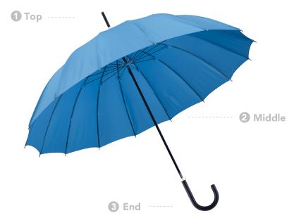 写真にあるように、傘をtop、middle、endの3つのパーツに分け、デザインや色違いで複数のバリエーションがあるんです。