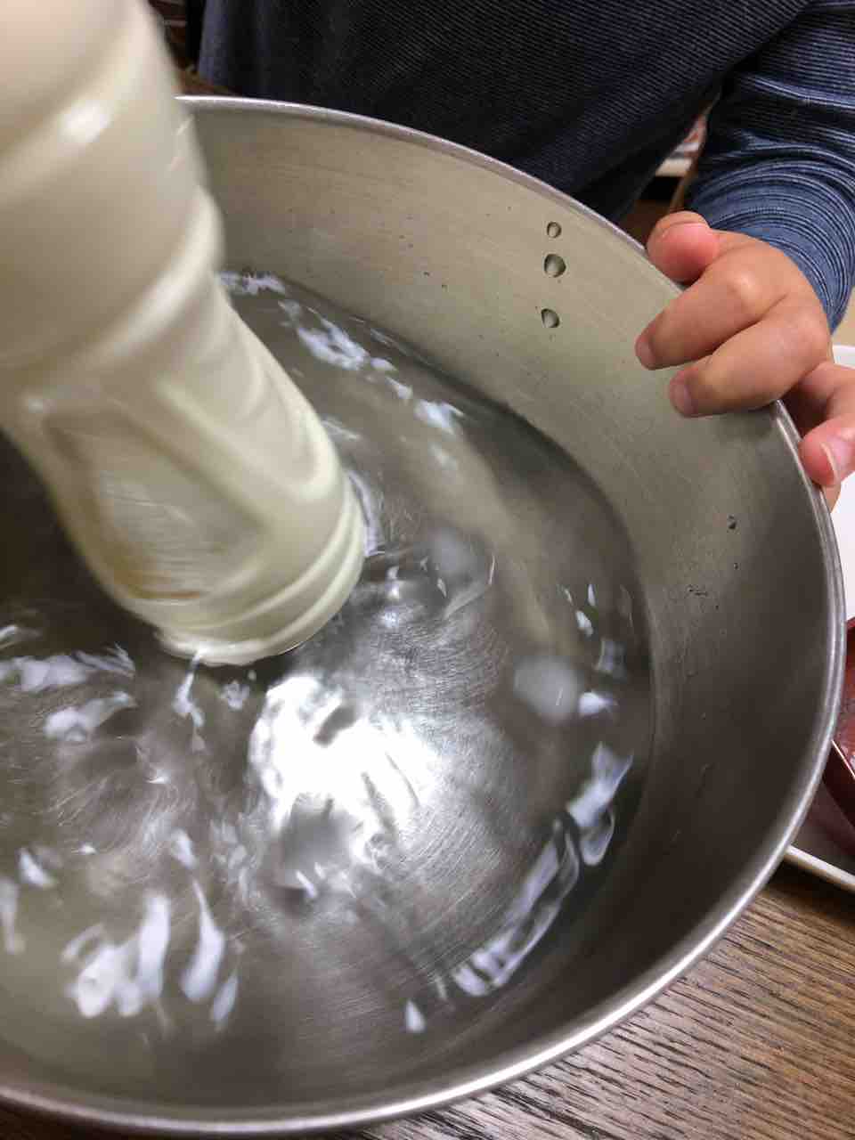 冷えた生クリームを空のペットボトルに注ぎます。