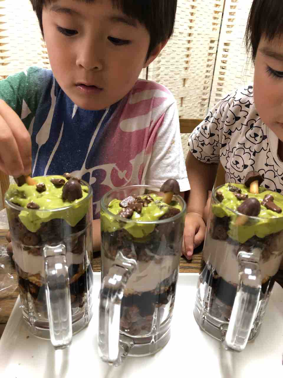 一番上を緑の大地にしたかったので抹茶プリンを入れ、きのこの山や小枝をトッピング。