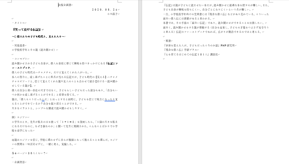 で、すぐに企画書を書いたのですが、いまから思えば本当に粗い企画書です…。最初から「オタク偉人伝」というタイトルを思い描いていたわけではなく、とにかく「偉人の子ども時代を読んで、子どもは偉人を身近に感じ、親は『偉人だってこうだったんだ〜』と思え、子どもを認めてあげることができる」というのを趣旨として書きました。